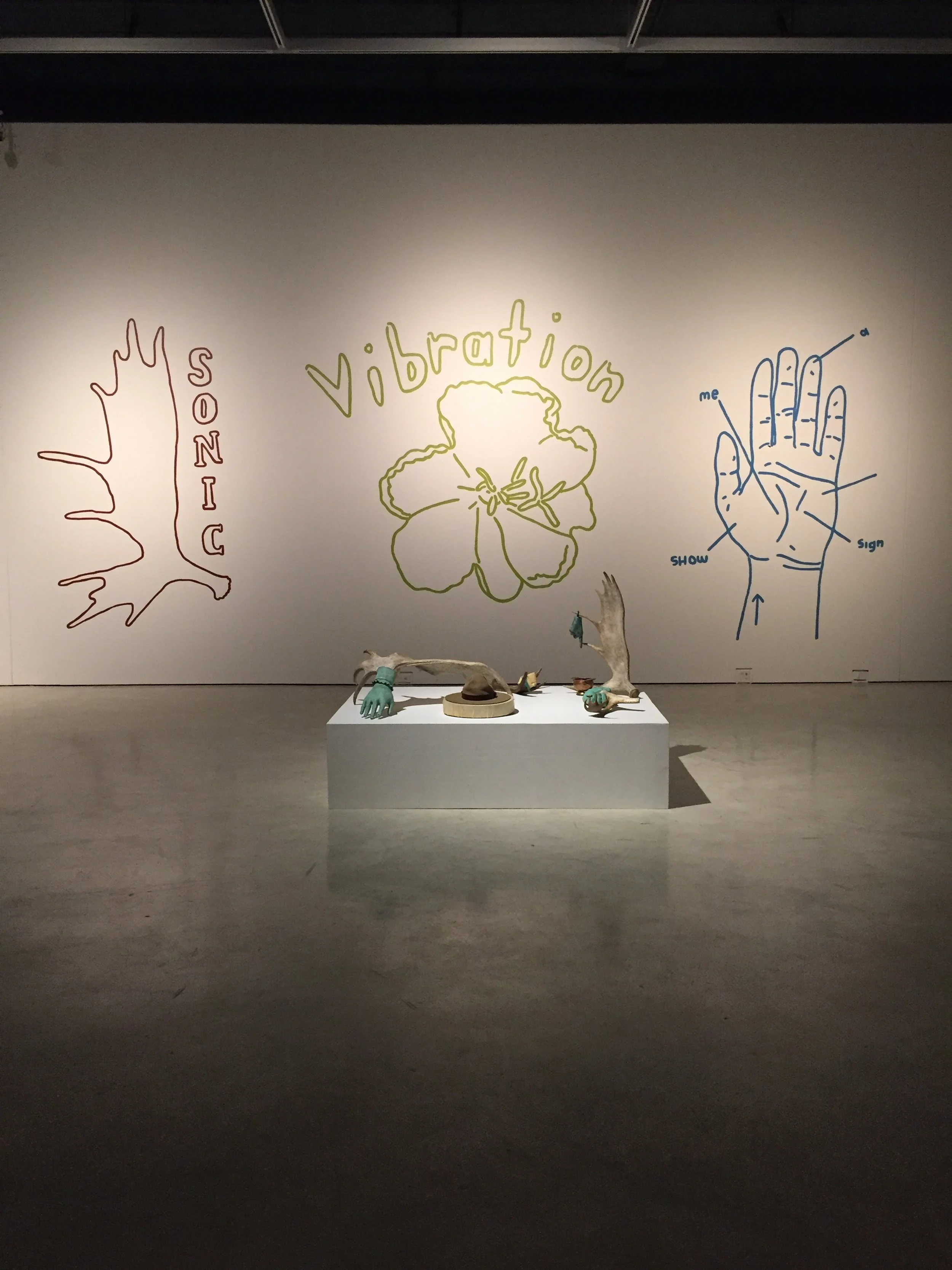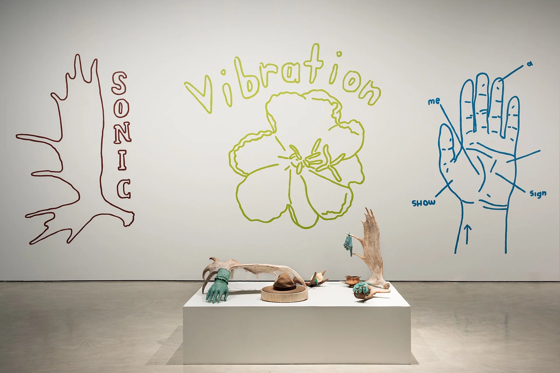 Within nadyes / you come back, Logan MacDonald uses sculptural installation to lyrically fixate on the learning and communication that exists outside colonial norms of communication, and to consider how erasure that is imposed by colonial mechanism can be subverted. MacDonald incorporates bronze strategically as a symbolic signifier to reference the perpetuated colonial narratives and systems imposed on our landscapes and bodies - and the hierarchical ways in which we are expected to teach and learn. He employs these bronze pieces in a dismantled/fragmented state, to subvert their power - absorbing the structures as aides that help form tableaux that support new meanings, histories, perspectives, movements, conversations, teachings. nadyes / you come back is presented as a series of small arranged sculptural installations and imagery traced on the wall. Together they form a large coded assemblage, with each piece, in some way, gesturing to the embodiment of knowledge: how our bodies can learn and teach through movements, vibrations, bodily cues, and how these signals have the capacity to transmit and extend between generations. nadyes / you come back is an attempt to lyrically highlight how we are capable of communicating beyond colonial language, to illustrate how Indigenous, queer, and crip folks have and continue to strategize to communicate our knowledge, needs, desires. How we have lived within the colonial systems, but are able to communicate beyond these limits, to survive in a system designed to ensure our erasure. The shed antler incorporated into nadyes / you come back is an example of MacDonald's conceptual approach, by incorporating this biological material to reference a part of an animal's body that is speculated to help them sonically hear both mates and prey.