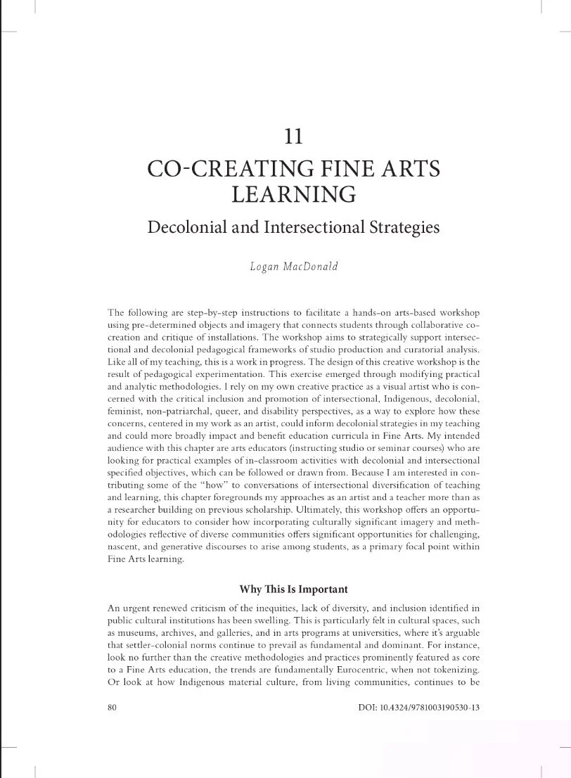 Citation: MacDonald, Logan. "Co-Creating Fine Arts Learning: Decolonial and Intersectional Strategies." The Routledge Companion to Decolonizing Art, Craft, and Visual Culture Education. Routledge, 2023. 80-88.